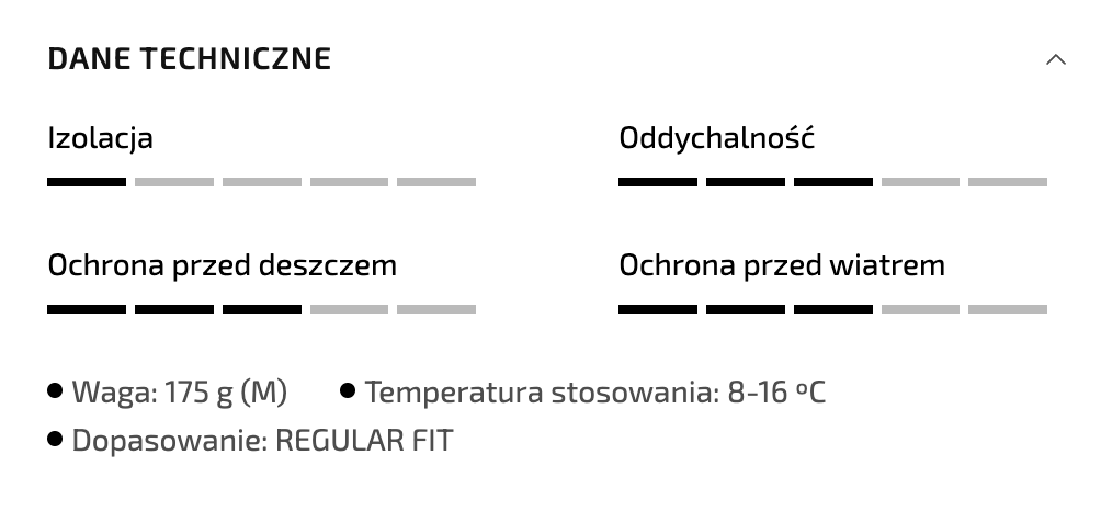 • Elastyczne i dopasowane mankiety i pas dopasowujące się do ciała, chroniące przed wiatrem.