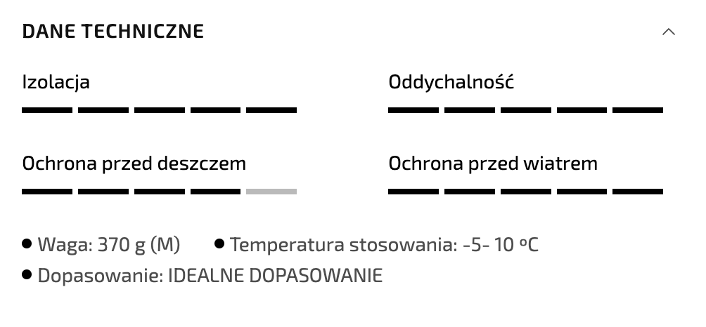 - Elastyczne mankiety i pas: doskonałe dopasowanie, zapewniające szczelność i wygodę noszenia z rękawiczkami.