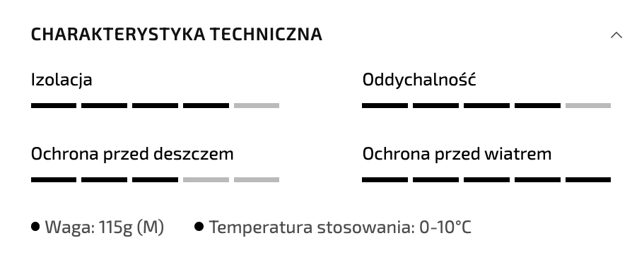 - Wodoodporność i wiatroszczelność: zewnętrzny materiał z membraną odporną na wodę i wiatr, która jednocześnie zapewnia oddychalność. Do wypełnienia izolującego zastosowano Primaloft® Gold, najlepszą syntetyczną alternatywę dla klasycznego puchu. Oferuje podobną pojemność cieplną, ściśliwość i wagę, a także chroni przed zimnem w warunkach dużej wilgotności. Jej ultracienkie włókna zatrzymują ciepło ciała, regulując temperaturę wnętrza, a dzięki hydrofobowości odprowadzają wilgoć do warstw zewnętrznych.